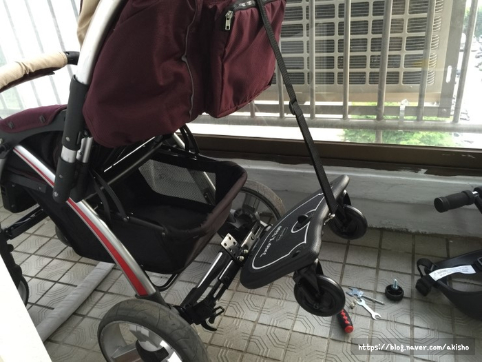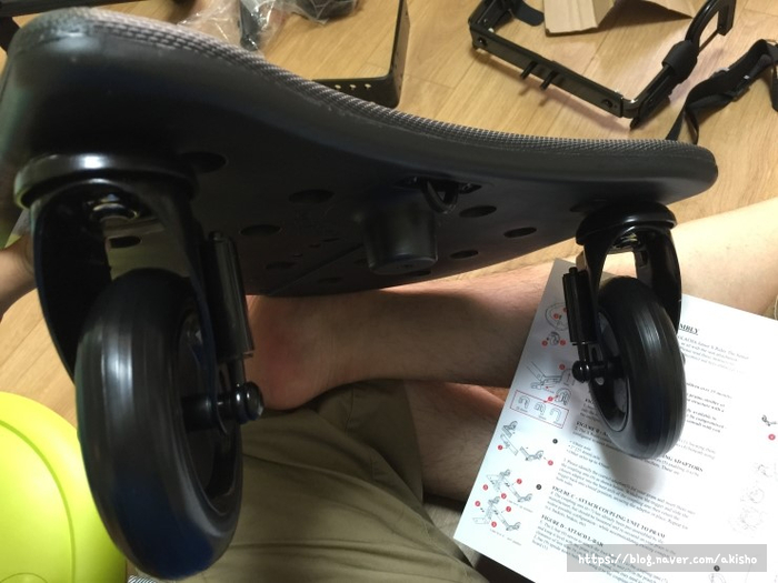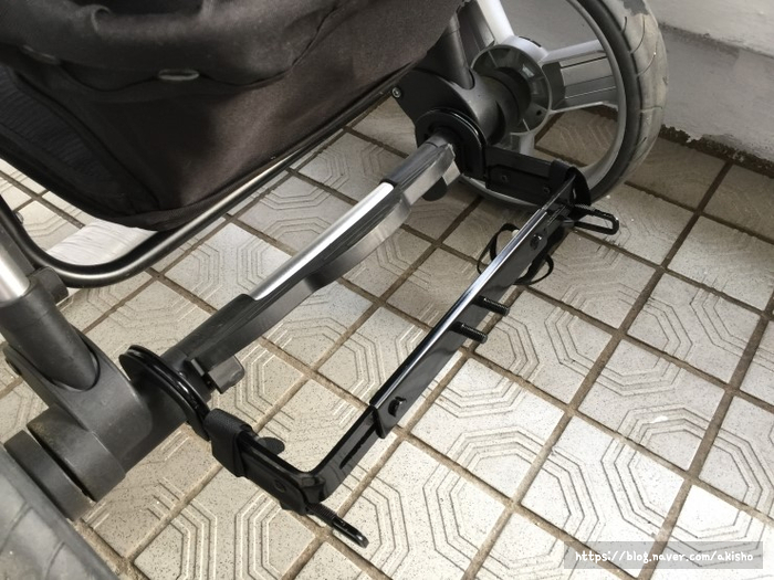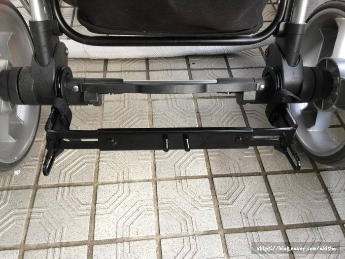 이 부분이 가장 중요하다고 할 수 있는데, 가지고 있는 유모차를 연결하는 부분이다. 유모차마다 바퀴 축 굵기가 다르기 때문에, 거치 고리 사이즈도 다양하게 제공된다. 그리고 거치대를 걸고 간격 및 높이 조절을 해 주어야 한다. 기존 조립된 걸 풀어서 다시 내 유모차에 맞춘 다음 다시 나사를 조여주어야 한다.