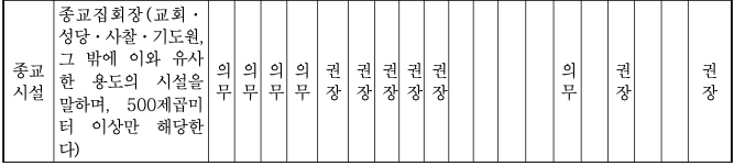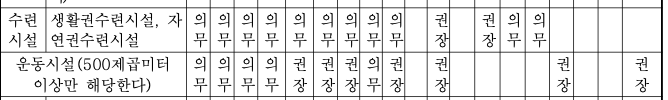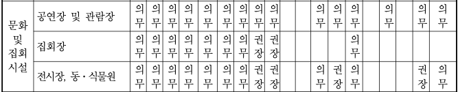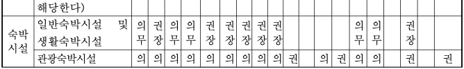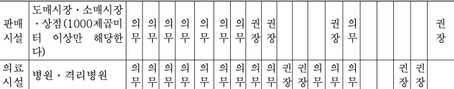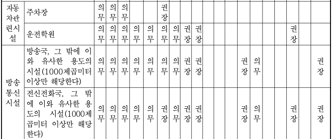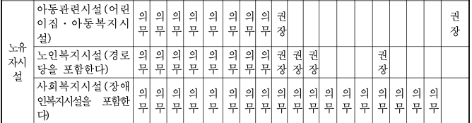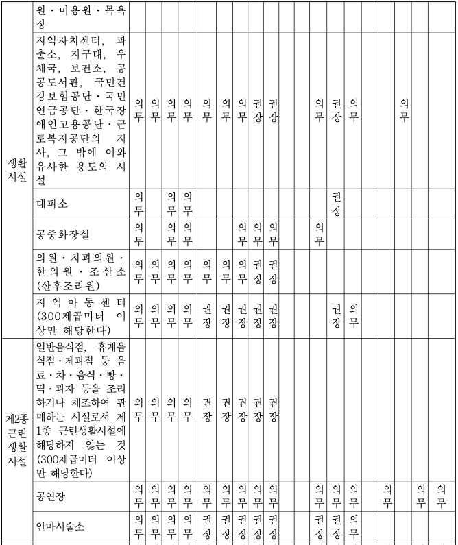 시설별로 설치하여야 하는 장애인 편의시설의 종류 (의무 혹은 권장 여부)