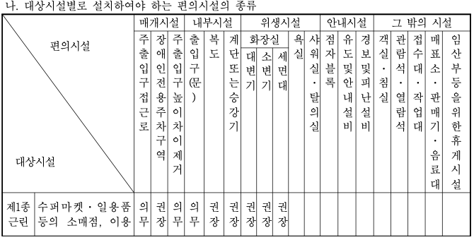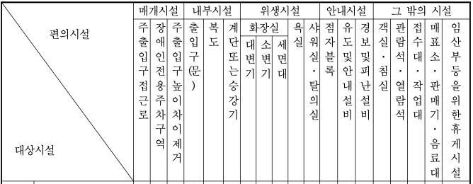 대상 시설별로 설치하여야 하는 편의 시설의 종류