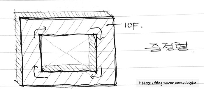둘째, 중정형이 되면 복도를 중심으로 양쪽에 실이 붙는 직사각형의 도넛 모양의 건물이 되는데 꺾이는 모서리 부분의 호실들과 내측 중정에 위치한 호실들은 서로 프라이버시 간섭이 생길 수 있다.