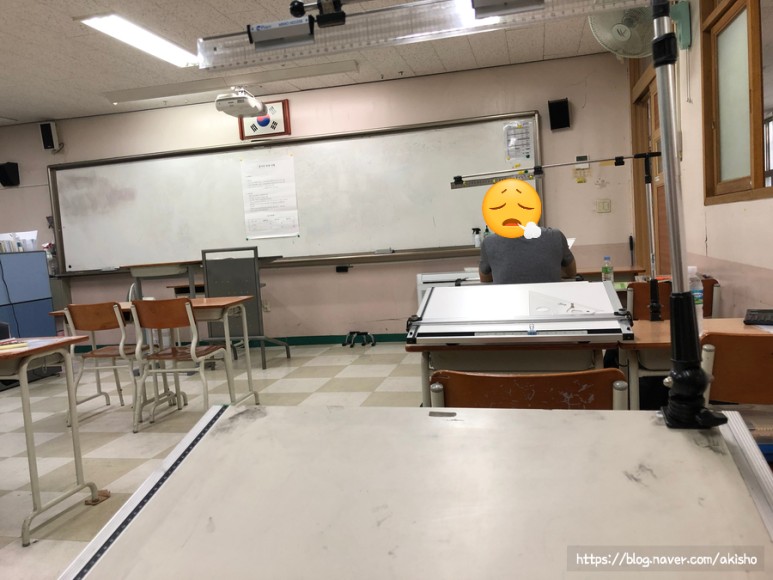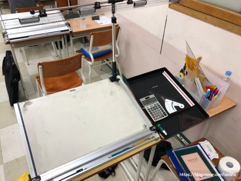 9시 시험 시작이지만 7시 40분 제도판과 제도 기구 세팅 완료.