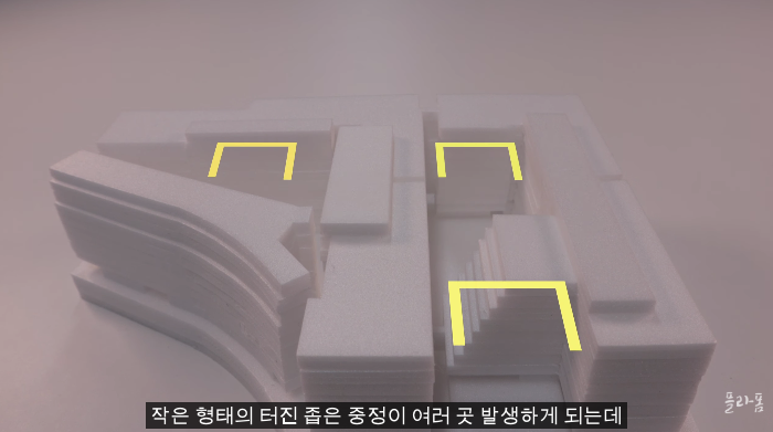 또 핑거형 타입의 특성상 최대한 많은 호실을 밀어넣다 보니 작은 형태의 터진 좁은 중정이 여러곳 발생하게 되는데 이렇게 되면 마주 보는 호실 간 시선 간섭이 불가피하다.