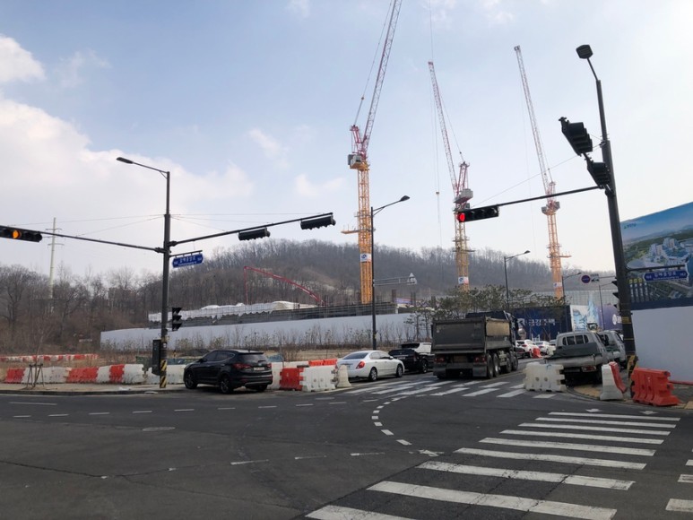 가장 진도가 빠른 곳이 금강펜테리움인데, 한참 지하층 골조공사가 진행 중이었다. 아마 올가을쯤 되면 10층 골조까지 완성이 돼서 어느 정도 건물 모양새가 나오지 않을까 예상한다. 역시 도면으로 보는 것과 현장에서 보는 스케일은 완전히 다르다. (크다.. 커)