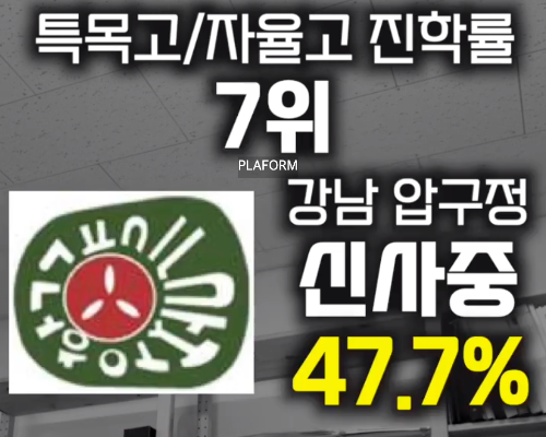7위를 차지한 신사중학교는 강남구 압구정동에 위치하고 있는 학교다. 재학생 130명 가운데 과학고 1명, 외국어고 3명, 예체고 3명, 자사고 55명, 총 62명(47.7%)의 학생이 진학했다.