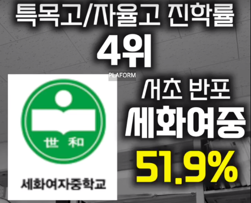 4위를 차지한 세화여자중학교는 서초구 반포동에 위치하고 있는 학교다. 재학생 264명 가운데, 과학고 1명, 외국어고 10명, 예체고 8명, 자사고 118명, 총 137명(51.9%)의 학생이 진학했다.
