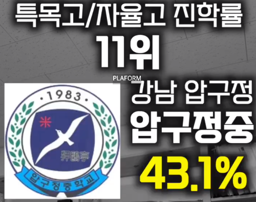 11위를 차지한 압구정중학교는 강남구 압구정동에 위치하고 있는 학교다. 재학생 137명 가운데 과학고 1명, 외국어고 9명, 예체고 1명, 자사고 48명, 총 59명의 학생이 진학했다.