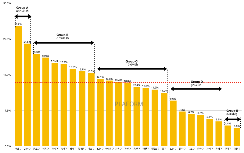 서울시 각 구별로 특목고/자사고 진학비율을 평균내 보면 서초구(25.2%)와 강남구(21.5%)가 가장 높게 나타난다. 하지만, 지역별 평균이 높다고 가장 비율이 높은 학교가 있는 것은 아니다. 서초구가 평균적으로 과학고, 외국어고, 자사고에 진학하는 아이들이 많은 편이지만, 서울내에서 가장 많은 학생을 진학시킨 중학교는 다른 구(區)에 있다.